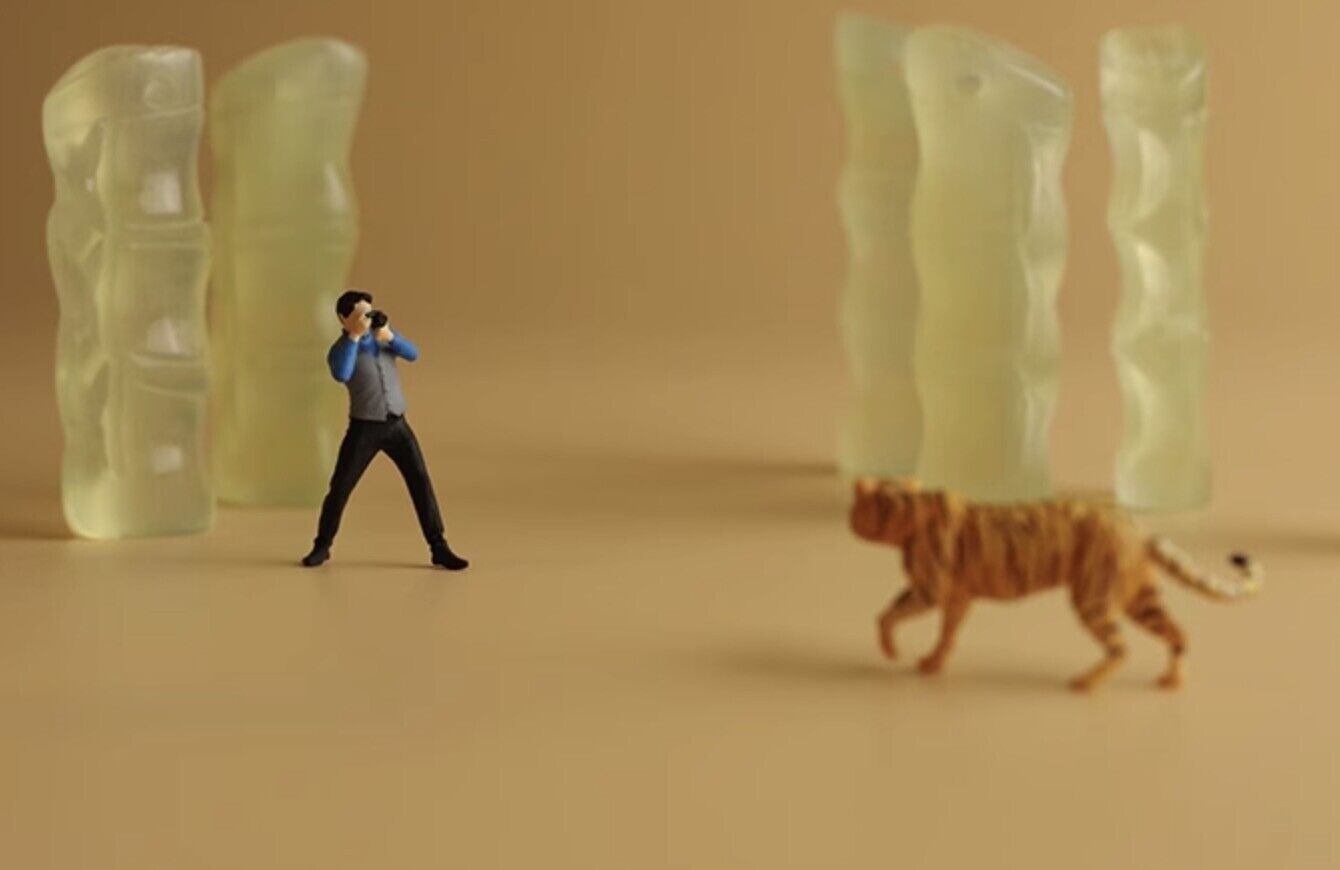 • Load image into Gallery viewer, 1:64 Painted Figure Model Miniature Resin Diorama Sand Wild Photographer Tiger