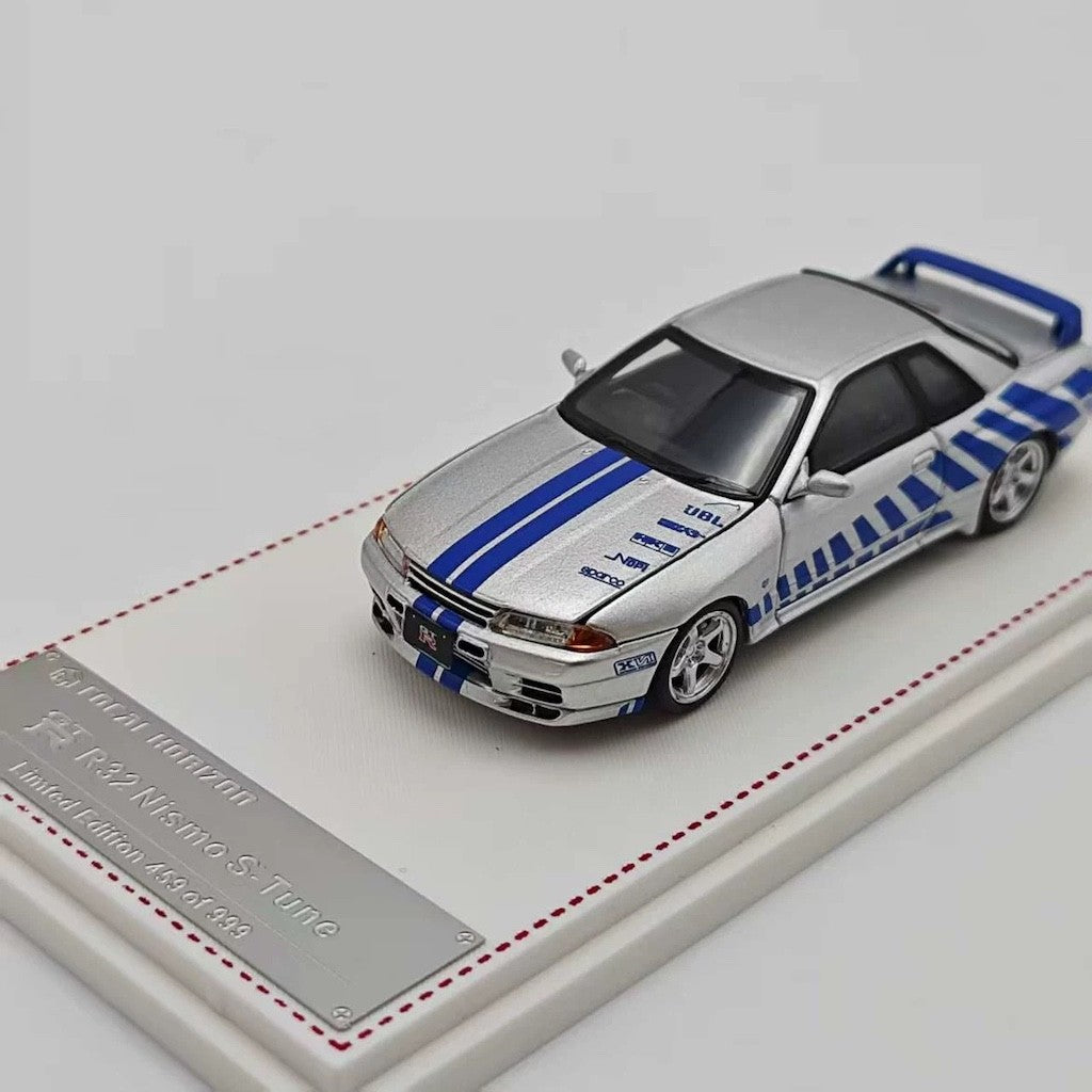 FH 1:64 Silver Blue Skyline GTR R32 Nismo Sports Model Diecast Metal Car New Collection