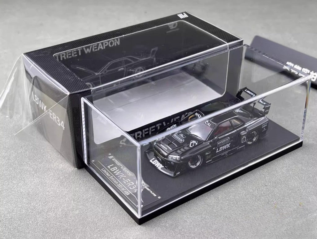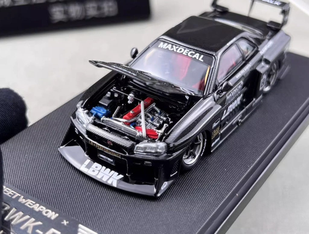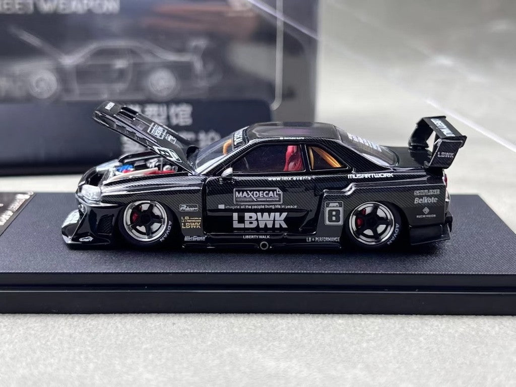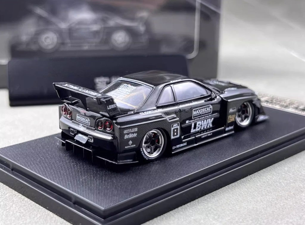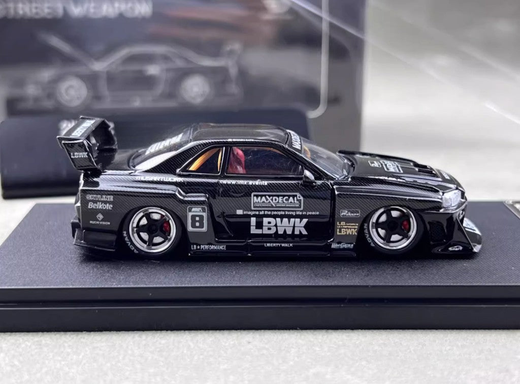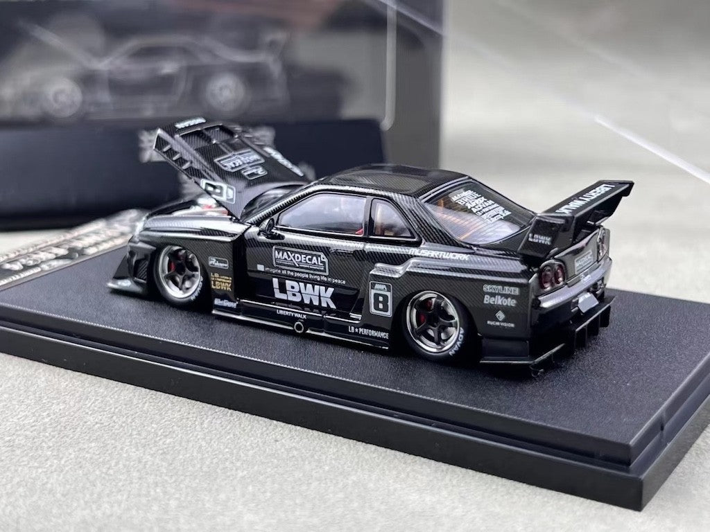 SW 1:64 Black Carbon Skyline GTR ER34 LBWK #8 Sports Model Diecast Metal Car
